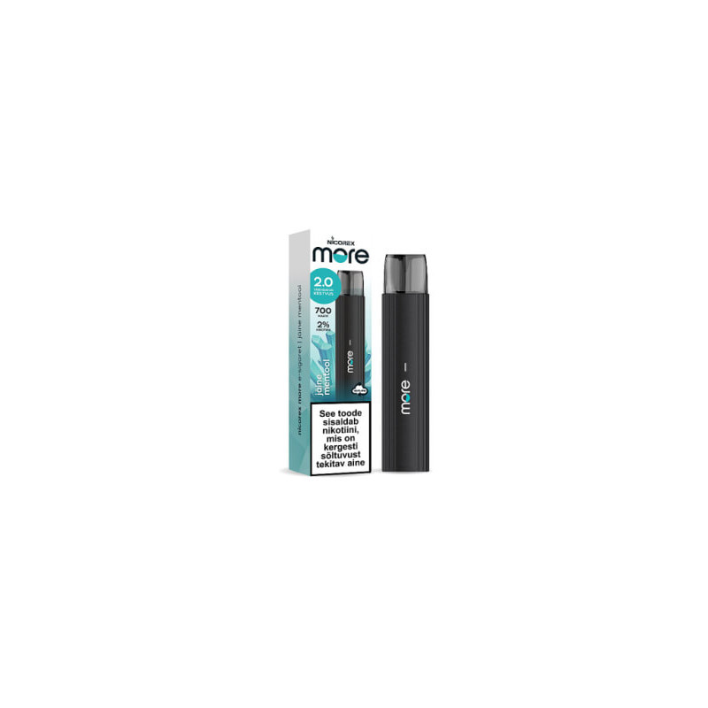 Nicorex MORE e-sigaret - loodud spetsiaalselt suitsetajate jaoks. Nüüd uus More 2.0 suurema ja võimsama akuga, millega saad 700 mahvi! Suurem aku tagab, et saad vedeliku lõpuni ära kasutada, ilma et peaksid muretsema maitse kadumise pärast või kahtlustama toodet praagis. Uus MORE on käepärane ja mugav ning kohe kasutusvalmis suupärase läbipaistva huulikuga e-sigaret, mis sobib ideaalselt kõigile suitsetajatele vähemkahjulikuma alternatiivina. Tänu läbipaistvale huulikule tead täpselt, kauaks e-sigaretti veel jagub ning saad jälgida vedeliku jääki. - Rohkem maitset; - Keraamiline küttekeha, mis toodab väga puhast ja rikkalikku maitset; - Lisaks 2% nikotiinisisaldusele saadaval ka 1% nikotiinisisaldusega e-sigaret; - Ei toimu põlemist; - Toimub aurustumine; - Ei vaja hooldamist; - Puudub halb lõhn; - Kohe kasutusvalmis; Variatsioonid: Mentool – värske ja jäine. Loobu stressivabalt tavasigarettidest, ära muretse ja usalda ennast ning tee juba täna esimene samm tavasigaretist loobumiseks. Skysmoke uued e-sigaretid on just selleks loodud. Meie oleme seda meelt, et e-sigaretid on oluliselt parem valik kui tavasigaret. Spetsifikatsioon: 700 kuni ühe sekundi pikkust mahvi Vedeliku kogus: 2 ml Aku mahutavus: 500 mAh Kasutamine: Ava pakend ja eemalda seade. Eemalda seadme otsas olevad tihendid/kile. Seadme kasutamiseks tee huulikust ca. ühesekundiline tõmme. Koostisosad: Glütserool, propüleenglükool, nikotiin 2%, lõhna- ja maitseained.