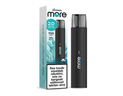 Nicorex MORE e-sigaret - loodud spetsiaalselt suitsetajate jaoks. Nüüd uus More 2.0 suurema ja võimsama akuga, millega saad 700 mahvi! Suurem aku tagab, et saad vedeliku lõpuni ära kasutada, ilma et peaksid muretsema maitse kadumise pärast või kahtlustama toodet praagis. Uus MORE on käepärane ja mugav ning kohe kasutusvalmis suupärase läbipaistva huulikuga e-sigaret, mis sobib ideaalselt kõigile suitsetajatele vähemkahjulikuma alternatiivina. Tänu läbipaistvale huulikule tead täpselt, kauaks e-sigaretti veel jagub ning saad jälgida vedeliku jääki. - Rohkem maitset; - Keraamiline küttekeha, mis toodab väga puhast ja rikkalikku maitset; - Lisaks 2% nikotiinisisaldusele saadaval ka 1% nikotiinisisaldusega e-sigaret; - Ei toimu põlemist; - Toimub aurustumine; - Ei vaja hooldamist; - Puudub halb lõhn; - Kohe kasutusvalmis; Variatsioonid: Mentool – värske ja jäine. Loobu stressivabalt tavasigarettidest, ära muretse ja usalda ennast ning tee juba täna esimene samm tavasigaretist loobumiseks. Skysmoke uued e-sigaretid on just selleks loodud. Meie oleme seda meelt, et e-sigaretid on oluliselt parem valik kui tavasigaret. Spetsifikatsioon: 700 kuni ühe sekundi pikkust mahvi Vedeliku kogus: 2 ml Aku mahutavus: 500 mAh Kasutamine: Ava pakend ja eemalda seade. Eemalda seadme otsas olevad tihendid/kile. Seadme kasutamiseks tee huulikust ca. ühesekundiline tõmme. Koostisosad: Glütserool, propüleenglükool, nikotiin 2%, lõhna- ja maitseained.